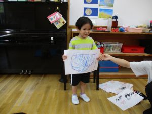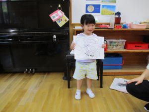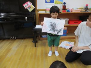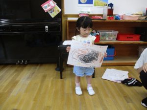 なが~いお休みの思い出を、頭の中で思い出しながら紙に描き、みんなの前で発表しました。