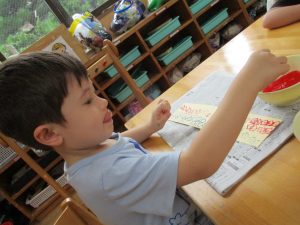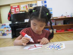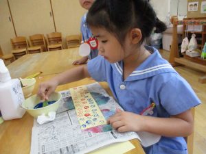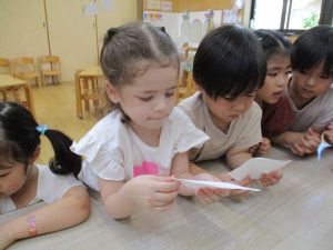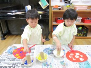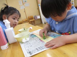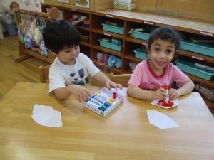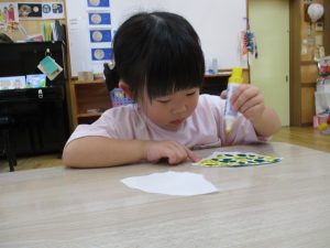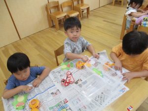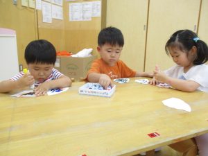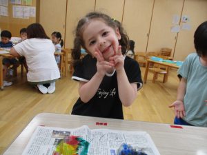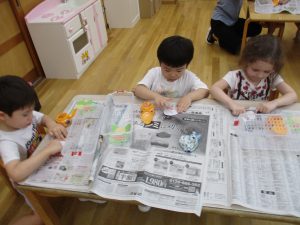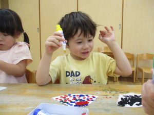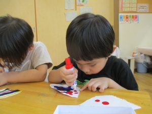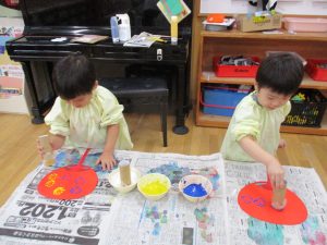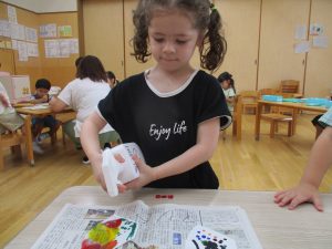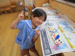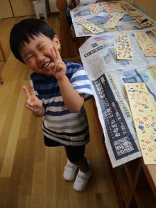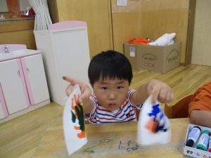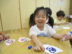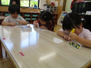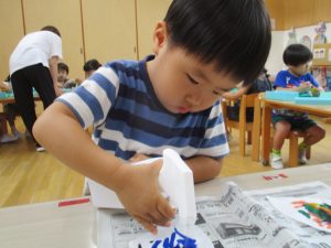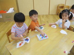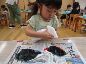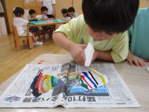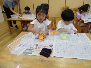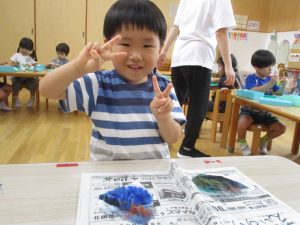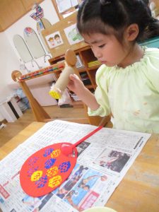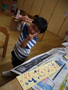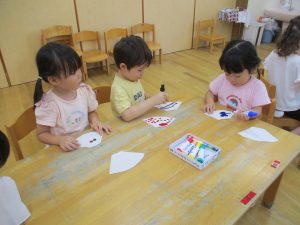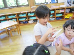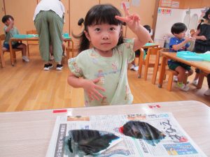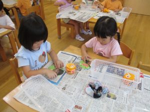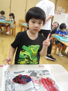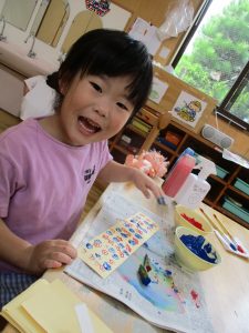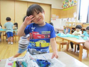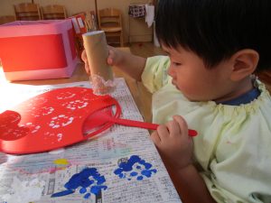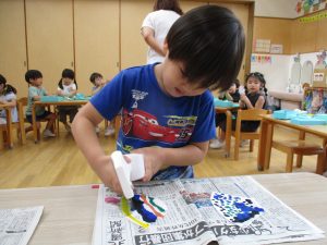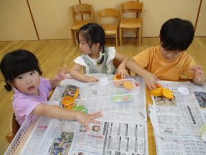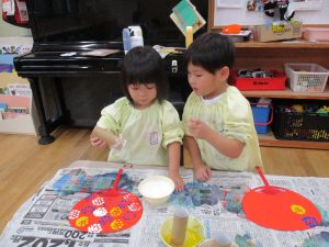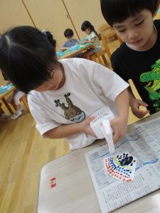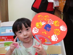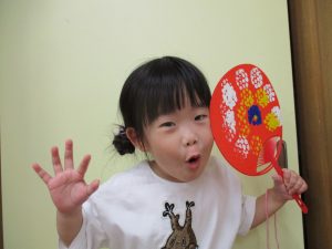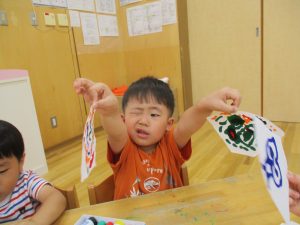 元気いっぱいの怪獣うちわが完成し、お友達と互いに見せ合いっこする姿もありましたよ。