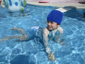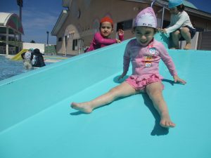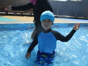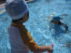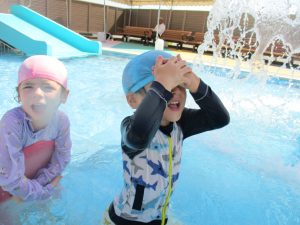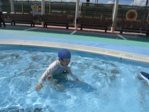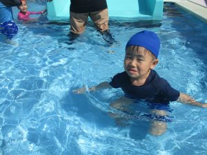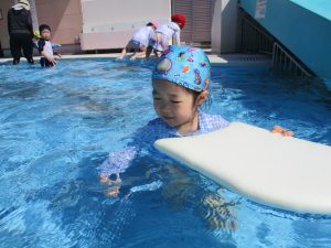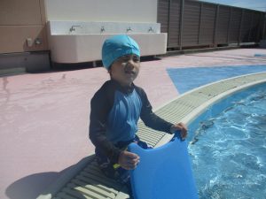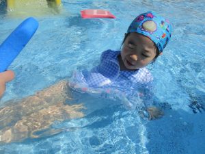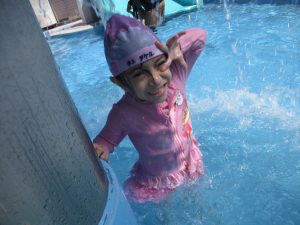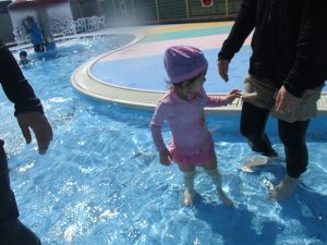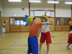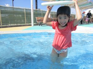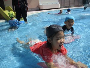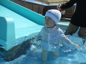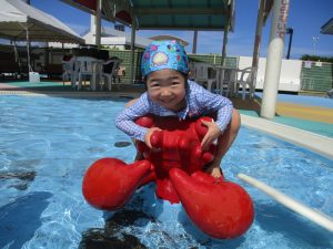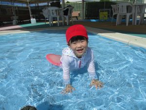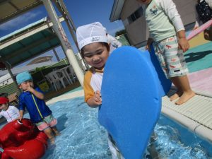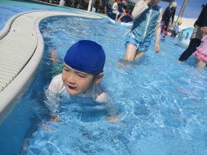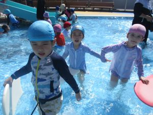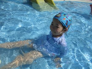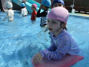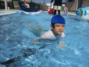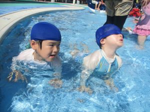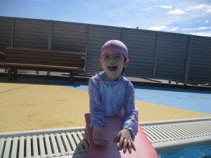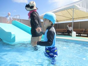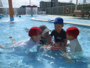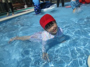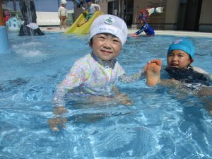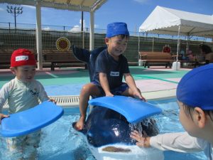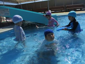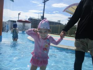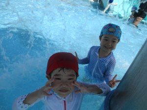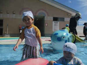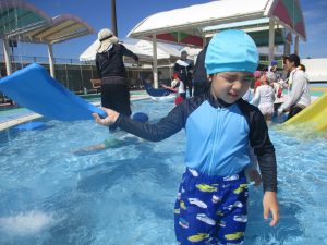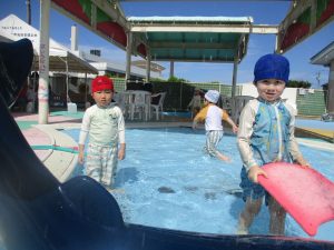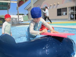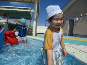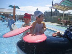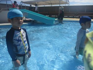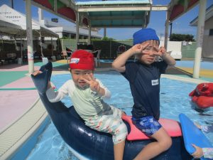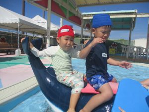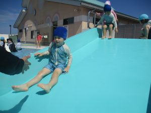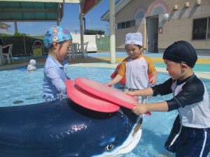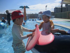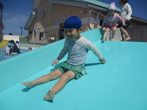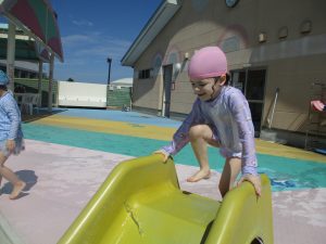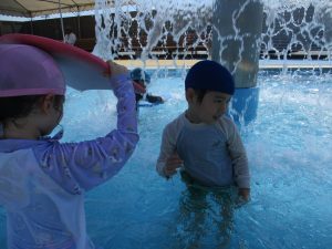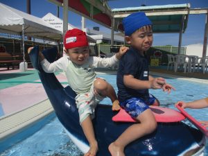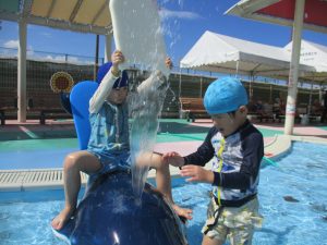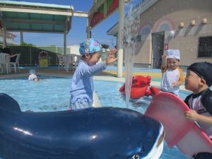 お友達や先生たちと水をかけ合ったり、すべり台に乗ったり、海の生き物の遊具に乗ったりしながら、時間いっぱい遊べました🎵