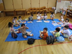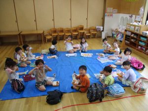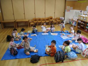 ↓先日、気分転換にブルーシートの上で輪になって給食を食べました🍱