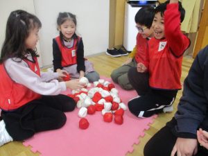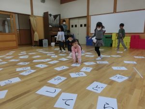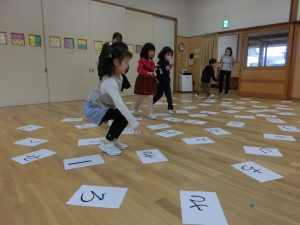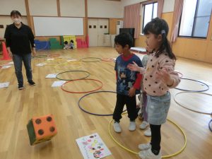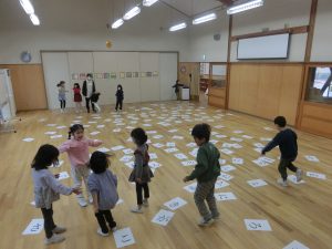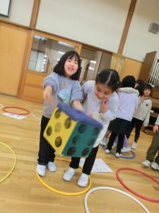 すごろくのマスを自分達で作って、ホールで人間すごろくをしました!