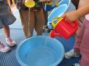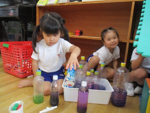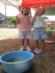 夏休みに入って、水遊びもしました!水の冷たさや泥の感触を感じながら、色水やおもちゃを使って涼しむことが出来ました☆彡