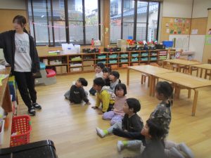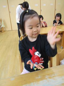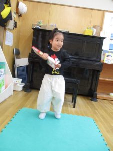 みんなに鬼の紹介をしました。「この鬼はね・・」から、お話してね。と伝えると、「この鬼はね、食いしん坊だからね、みんなを食べてしまうんだよ~」
