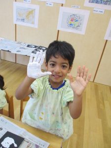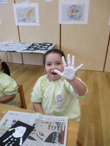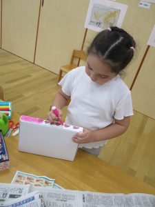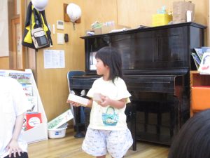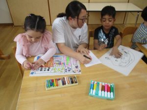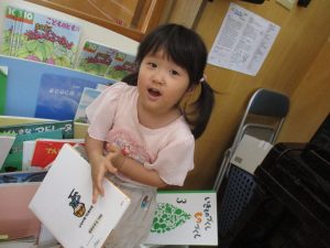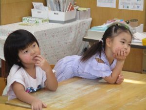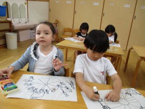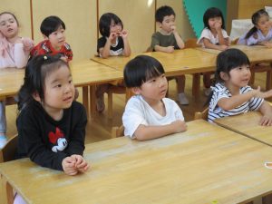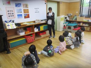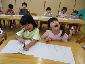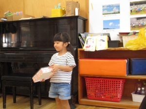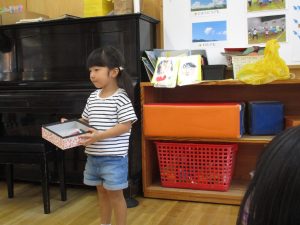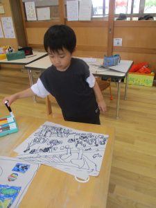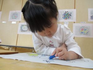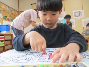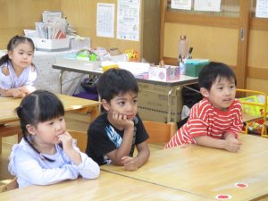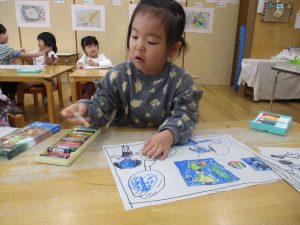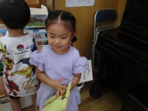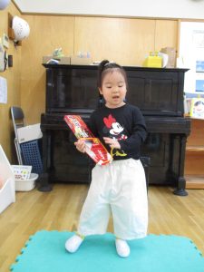 そして、みんなにお話を聞いてもらう時間です。「だるまちゃんは。。。」から、話し始める子どもたち。始めたこ頃は、1文で「おしまい」と話すことも多かったですが、自分の絵を見ると、お話が作れるよと伝えると、そこから、2文、3文、4文、どんどの話しが出てくるようになりました。