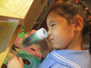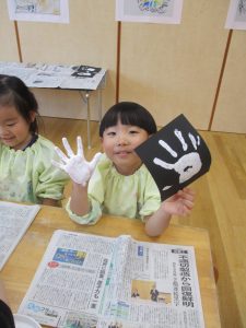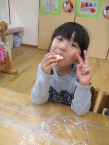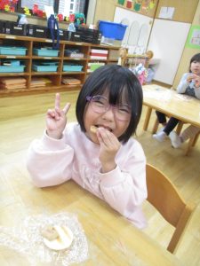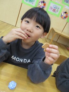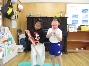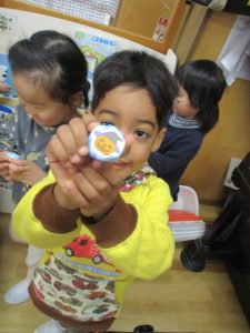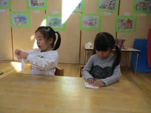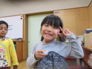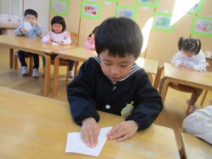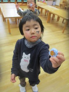 「この鬼はね~、優しくてね、悪者からみんなを守ってくれる!」「この鬼はね、つの1本!大きな鼻!!小さい目!!!」といろんな性格のユニークな表情の鬼さんが出来上がりました。折り紙絵話しの活動で、みんなの前で発表することを積み重ねてきた子どもたちは、力もついてきて、しっかり自分の鬼の紹介をすることができていました。