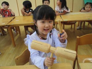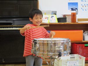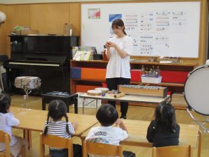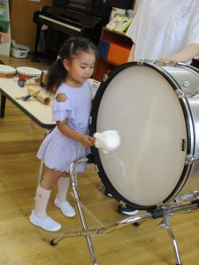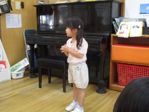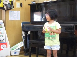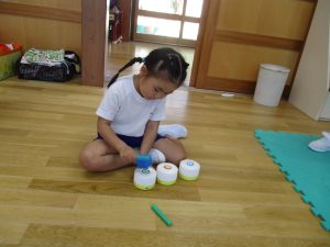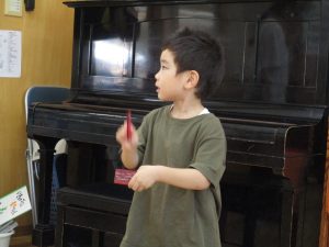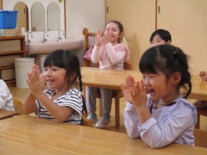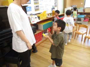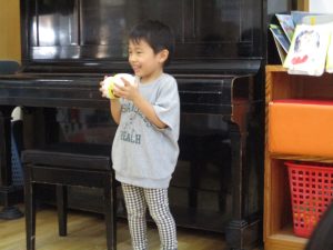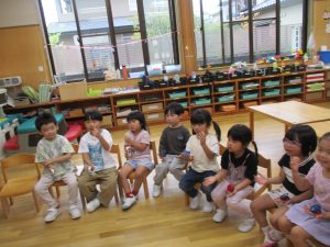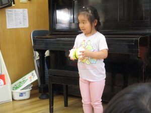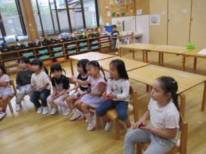 この日は、お話を聞く時もぱっと自分たちで1列に並んで座ったので、「さすがもうすぐ青組さんになる子たちだね。すばらしい。」と褒められて、黄組でのリトミック教室が終了しました(*^^*)