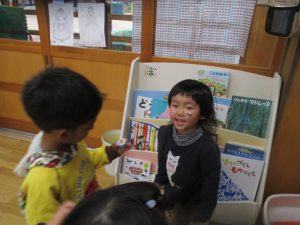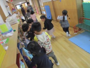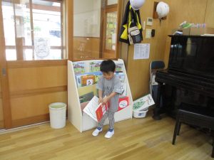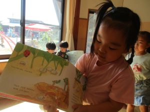お集りの前は、絵本を見て待つ時間。声を出しながら読む子、お友達と一緒に楽しむ子と様々です。
