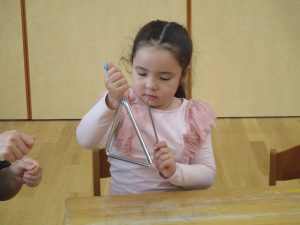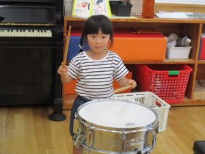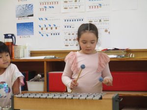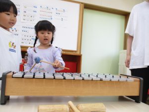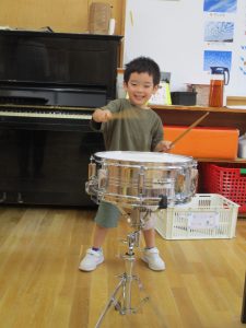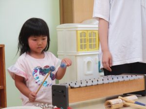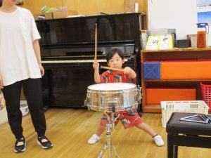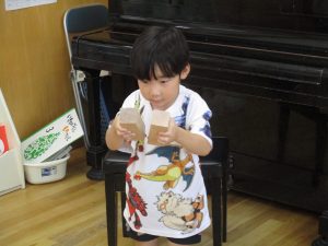 今月のリトミックは、リズムの取り方やスティックを使ってリズムの違いを楽しく学びました🥁先生の真似をしながらカチカチ音の鳴るスティックを叩き、四分音符や八分音符、二分音符の違いを「たーん」「ちちちち」と口にも出しながら挑戦!意外と難しく、苦戦しながらも一生懸命口を動かして最後まで頑張っていました👏