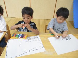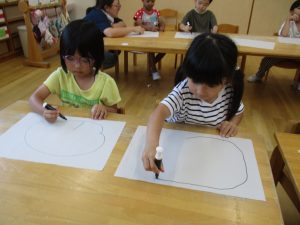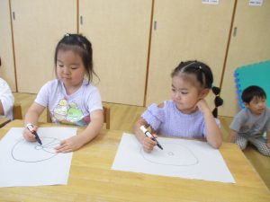 今月に入って、黄組さんのプランターのなすびが立派に実りました🍆クンクン匂いを嗅いだり手で触ってみたり…「なすびの匂いや!」「ツルツルする~」「あったかい!」と、採れたてのなすびに大興奮!!塩もみをしたりめんつゆにつけておいしく頂きました😋なすびが苦手なお友だちも、「一口食べてみる…!」と挑戦して食べていましたよ!別の日には初めての線画になすびを描きました✏️実際になすびを見ながら、形や色をよく観察していました!特に色にこだわり、紫と黒どっちだろう…?と悩み、色を重ねて描く子や、場所によって色を使い分ける子など様々な工夫が見られました♪その後もたくさん実るなすびを、順番に収穫しています☆