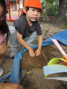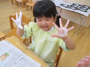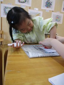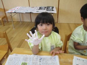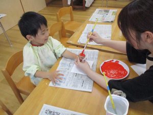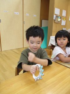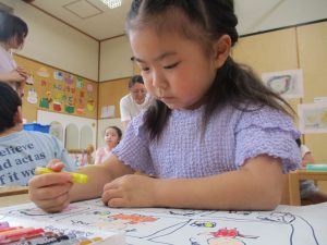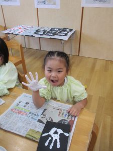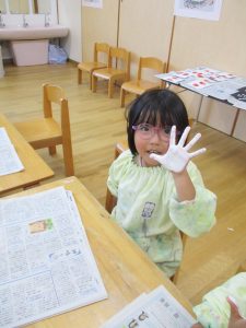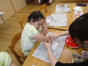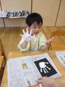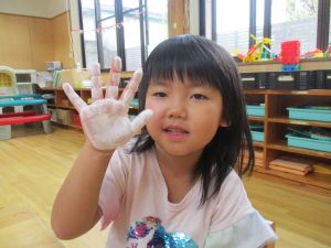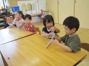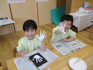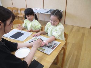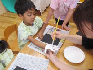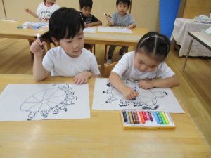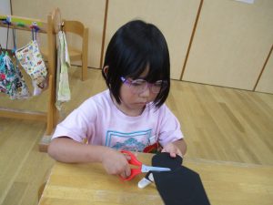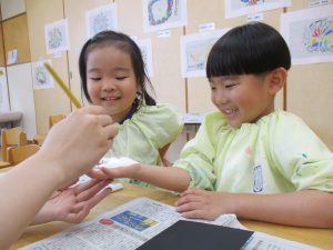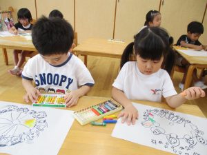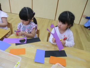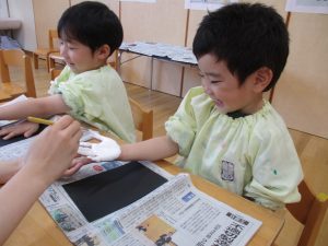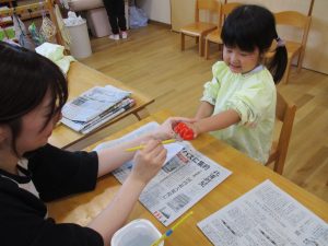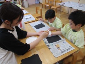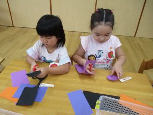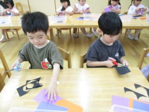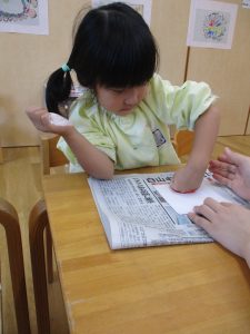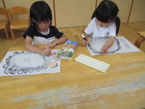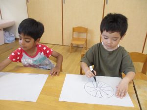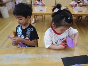 ひまわりは、ハサミで切込みを入れたものに、種を付けました。「種は真ん中に付いとるんやよ!」とお話しながら、二種類の違ったひまわりが完成!!完成は壁面をご覧ください♪