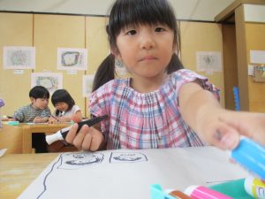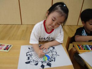 時間も「○の針で描くのはおしまいにする」ことを伝え、また5分前にもう1度時計を見てもらって、もうすぐ○の針になることを確認してもらうことで、最後みんなが描き上げることができました。時間を意識することも、普段の保育の中に入れ込んでいます。