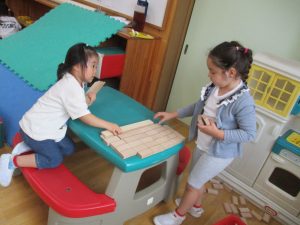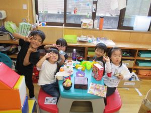 運動会の練習も頑張りながら、大好きなお友だちとの遊びも楽しんでいます!ブロックで作るもののレパートリーも増え、大きさも様々!工作では、好きな空箱などを探し、様々な素材を組み合わせながら、毎日素敵な作品が出来上がります👏製作等で使った余りの色紙なども工夫して使い、オリジナル作品が完成!いつもお家の人に見せることを楽しみにお持ち帰りしています😊そしてお医者さんごっこが大好きで、7月ころからずっと継続して遊んでいます🎶なりきる姿がとってもかわいいです😆