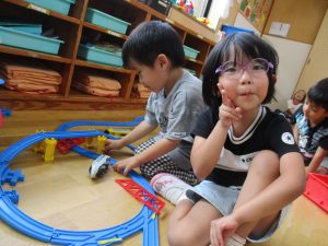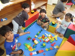 7月はブロック遊びをたくさんしました!いつもはお片付けの時間に作ったものを壊していましたが、お部屋に飾り場所を設置しました☆一生懸命作った作品を嬉しそうに飾っています😆そして、お医者さんごっこもブームです💉🩺手作りのナースハットや鏡をつけてなりきっています♪患者さんとお医者さんを順番に交代しながら、お薬や絆創膏で治療しています☆