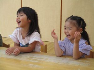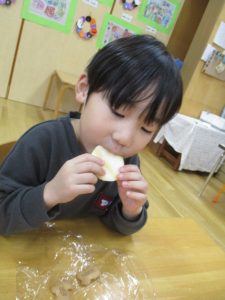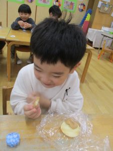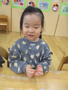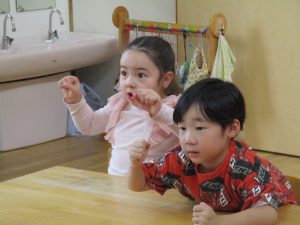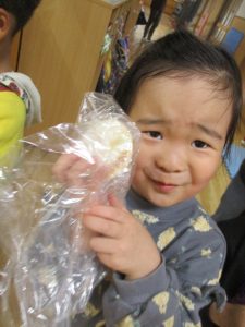 おもちの手遊び。顔をコネコネ、いつも顔を見合わせて、笑い合っています。この日は、お家の人に何餅が好きか聞くのをとても楽しみにしていたんです。
