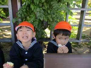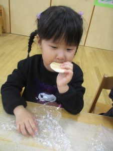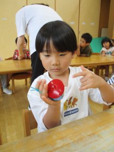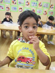 5月に植えた夏野菜が、少しずつ大きくなり、花や実が出てくるようになりました。そして、幼稚園のプランターには大きなきゅうりが実っていました!収穫したきゅうりを、触ったり匂いを嗅いだりすると、チクチクがあるところとツルツルしているところがあることに気付きました☆お部屋に戻ってから、ビニール袋の上から塩もみをして、お昼るごはんと一緒にいただきました。自分で塩もみしたきゅうりはいつもより美味しかったようで、みんなペロリと食べていましたよ♪