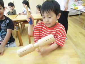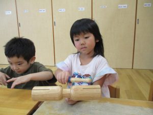 なにか型をつかってもいいよということで、木のおままごとを出しました。