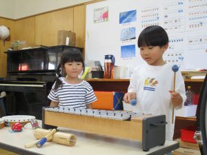 お部屋の中にある色々な音。みんなの近くにはどんな音が隠れているかな?と、お部屋の中で音探しゲームをしました!おもちゃとおもちゃを合わせて音を出したり、絵本を開け閉めしたり、椅子を鳴らしてみたり…それぞれが色々な音を探し、その中でお気に入りの音をみんなに発表しました😊聞こえる音をオノマトペ(言葉)にして、個性あふれる色々な音を発表し、拍手を送り合いました👏👏