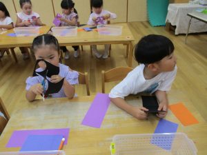 七夕製作は、保育参観の中で絵の具の吹き絵に挑戦!息を吹くと色んな方向に絵の具が飛んでいくのがおもしろく、吹く度に「わぁ~!」と嬉しそうにしていました☆星飾りや織姫・彦星の顔を描き、短冊にはお願い事を☆彡7月に入ったら、笹に飾る予定です♪