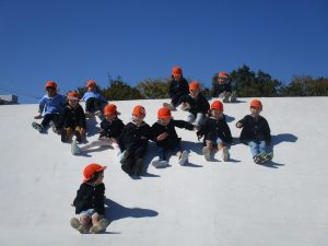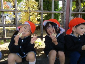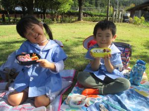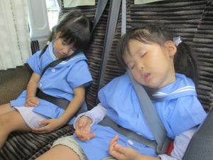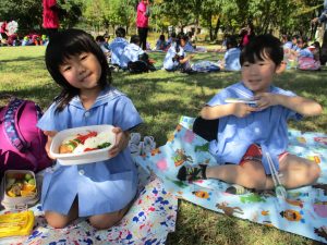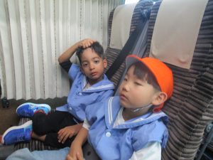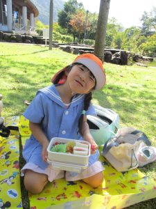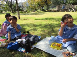 その後は吉岡園地に移動し、念願のお弁当👏ずっと楽しみにしていたお弁当は、お友だちや先生と顔を見合わせながら食べることができて、楽しい時間を過ごしました😋ご飯の後は、大型の遊具で遊んだり、たくさん落ちているどんぐりを拾ったりして遊びました🎶帰り道のバスの中はぐっすり眠る子も💤楽しい思い出になったね😊