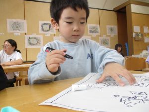 まずは、凧作りから。五角形に切ったビニールの凧に絵を描きました。