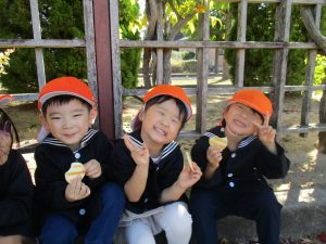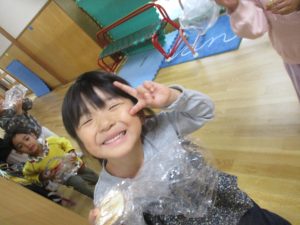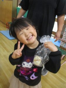 するとかぼちゃおばけから先生に電話が…「”ミッションを成功したみんなには、リュックの中にいい物が入ってる”だって!」みんなは大急ぎで自分のリュックの中を探しに行きました!そこにはなんとおやつが💕みんなで美味しく頂きました😋