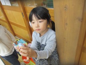 参観でお休みだったお友達。だるまちゃんの折り紙絵話しを「する?」と聞くと、「する!」と言って、自由遊びの時間に取り組みました。少しして自分から「ね~先生、みんなに話したい」と言ってきてくれました。「じゃ、帰りのお集りの時に話そうか」「うん!!(*^^*)」と言って、帰りにみんなにお話を聞いてもらいましたよ。自分から「話したい」と言ってくれたことが何より嬉しかったです(*^^*)