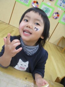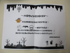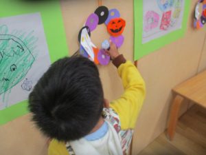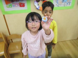 ハロウィンの日には、ホールからお部屋に戻るとなんと、かぼちゃおばけからのミッションが!ミッションは、かぼちゃおばけの絵が描かれたお宝を一人一つ探すこと!ミッションクリアに向けてみんなで協力してお宝を探しました👀なかなか見つからないお友だちには、「まってて!探してあげる!」と一緒に探してくれ、無事にみんな見つけることが出来ました👏