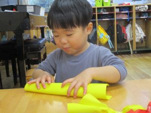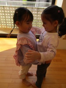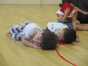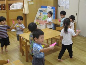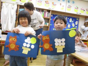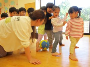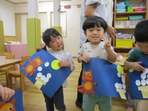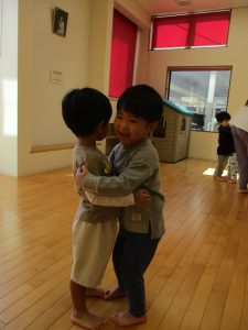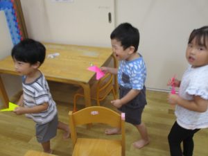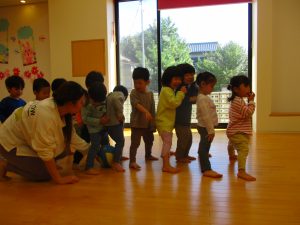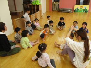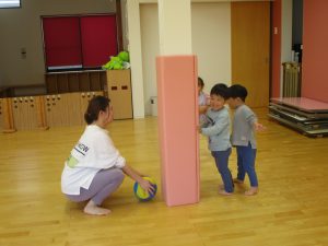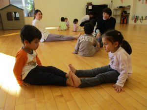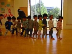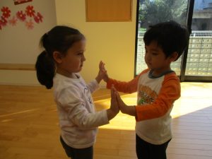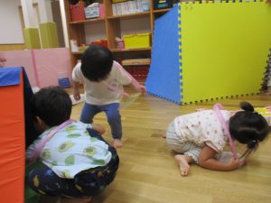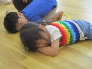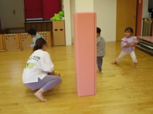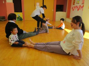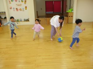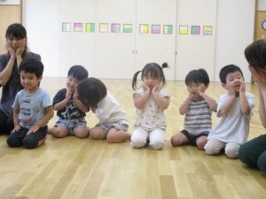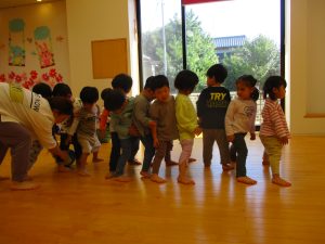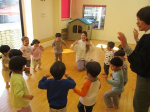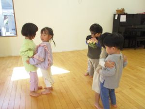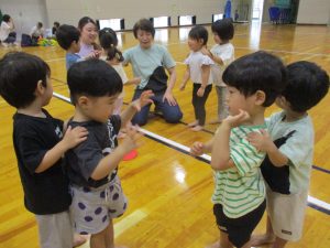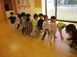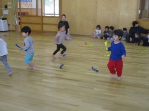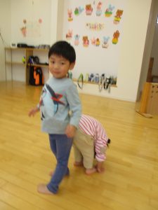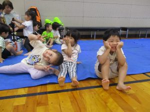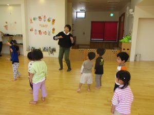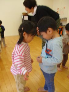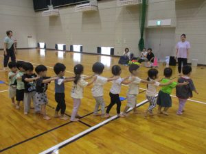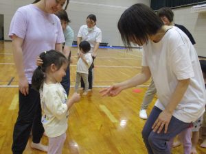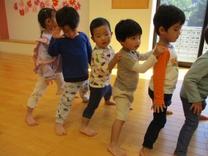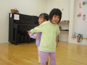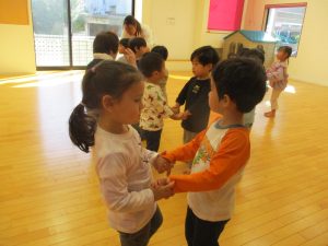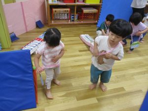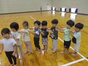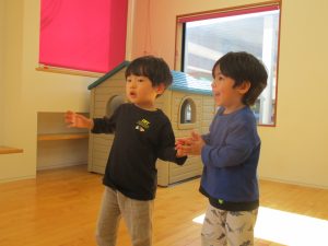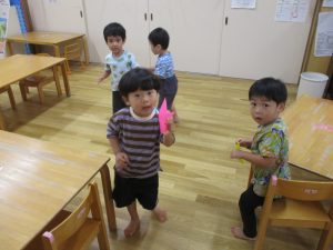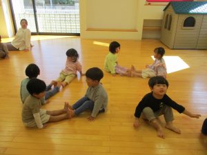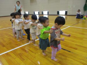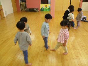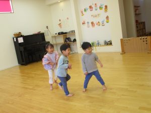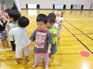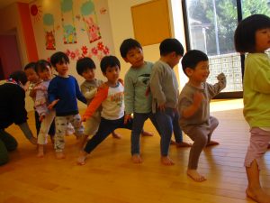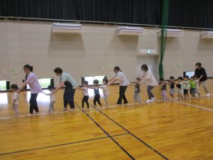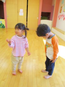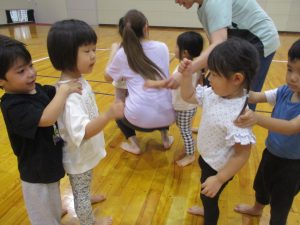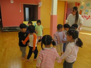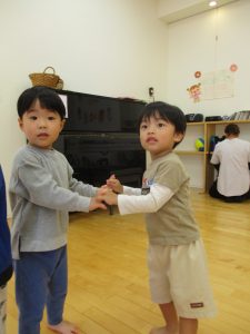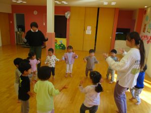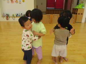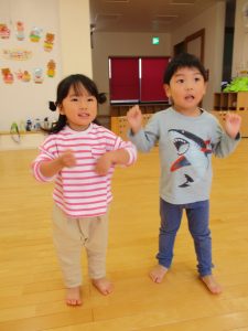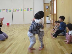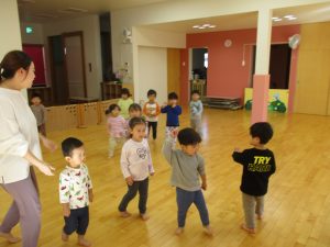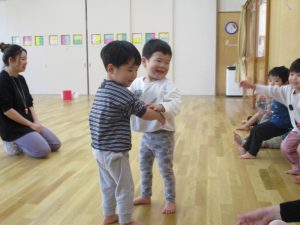 「あくしゅで こんいちは」と「ひっつき もっつき」の音楽に合わせてみんなで楽しみました!