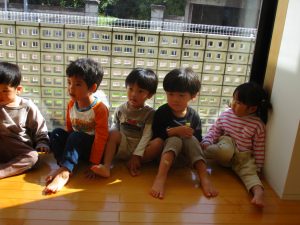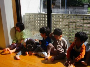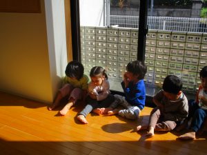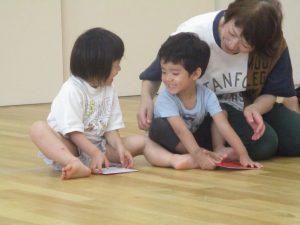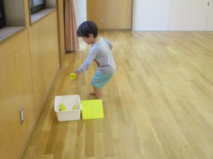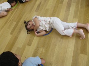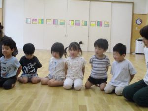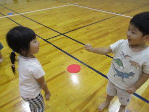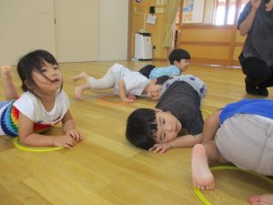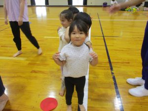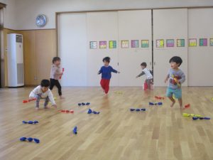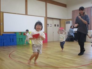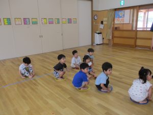 ピアノの音が止まると素早く輪っかの中に入りました!「自分の輪っか、どこにあるか分かるかな~?」