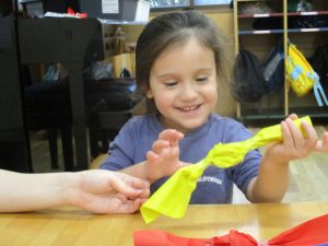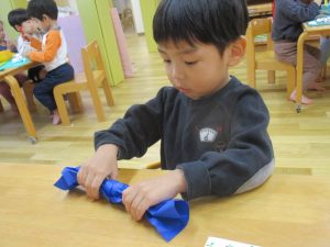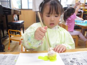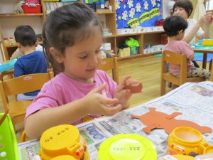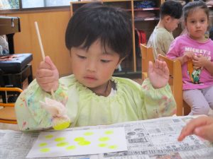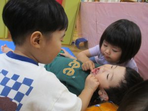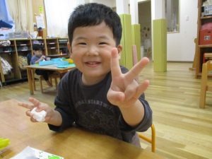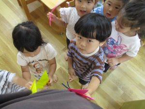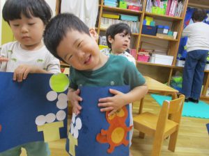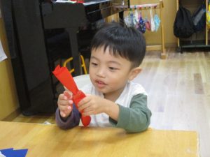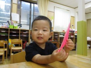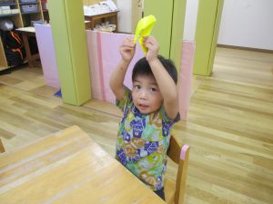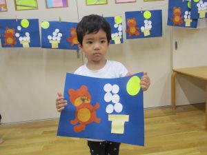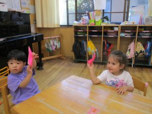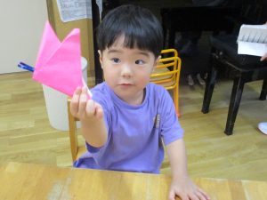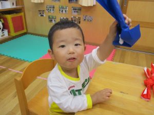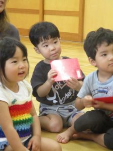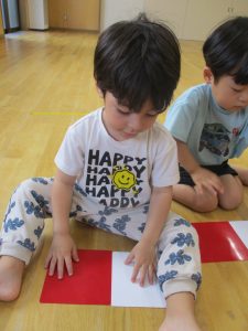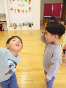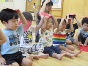 赤と白のカードを頭にのせたり!?耳に付けてみたり!?時には、、、。サンドイッチにして食べてみたり!?と音楽に合わせて先生の真似をしました😂