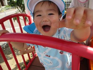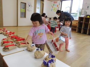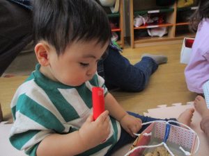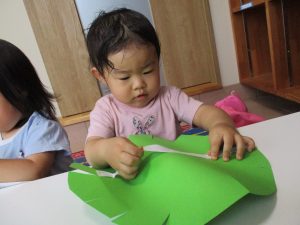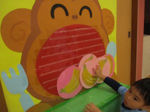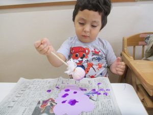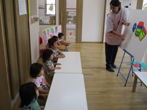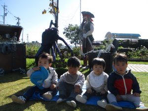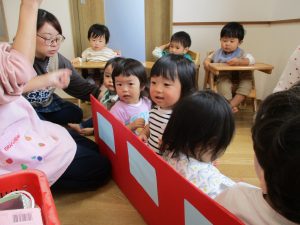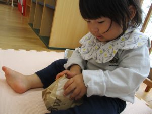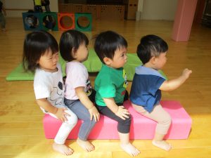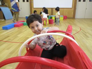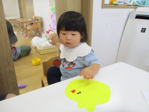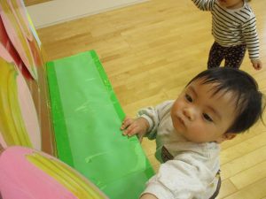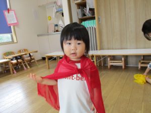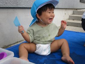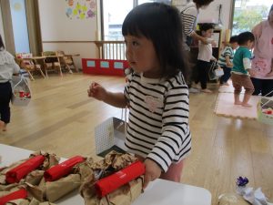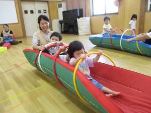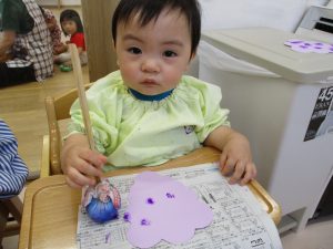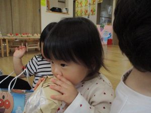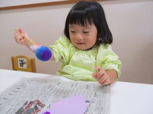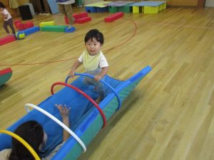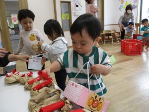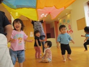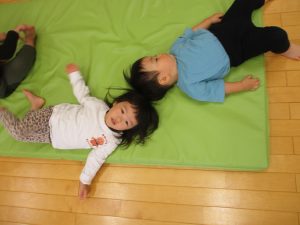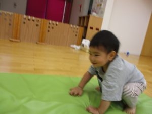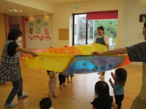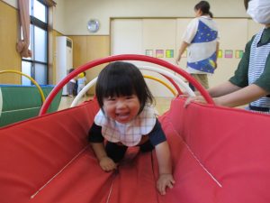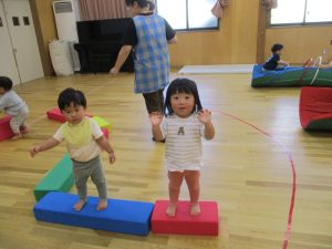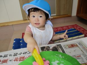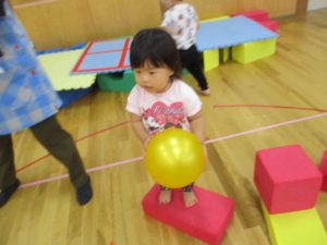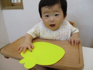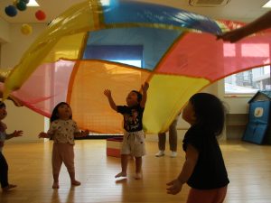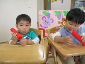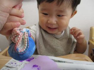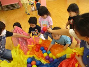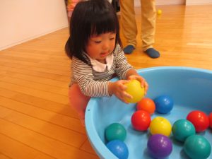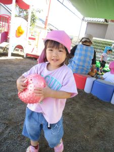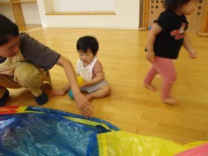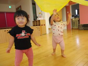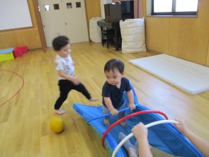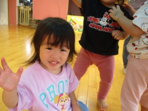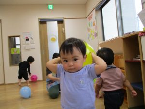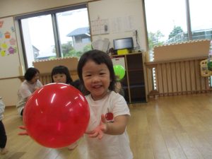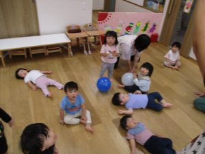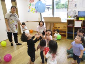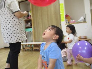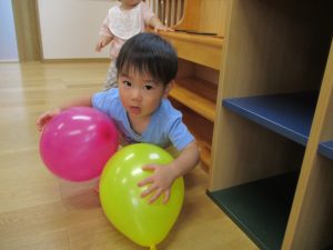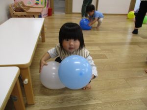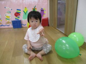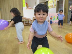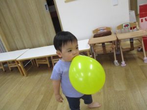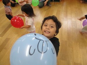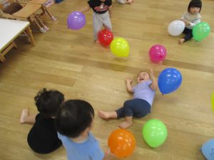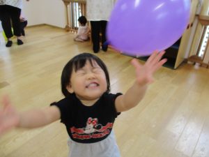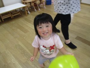 風船の口を結ばずに放し、ブーっっと風船が不安定な動きで飛んでいく姿に大笑いする子とびっくりしている子と色々でしたが、楽しい風船遊びにいい笑顔がたくさん見れました。