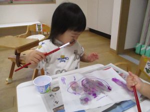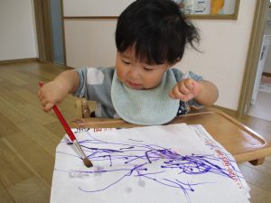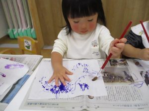 水筆でにじみ絵にしました。濡れていく様子やにじむ様子をじっと見ていました。