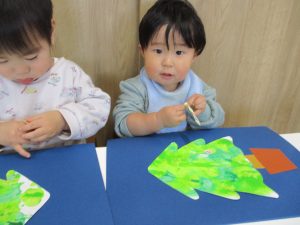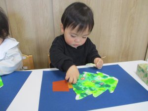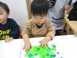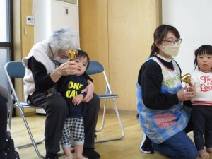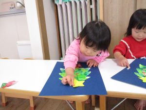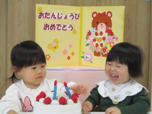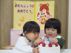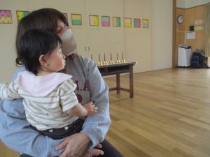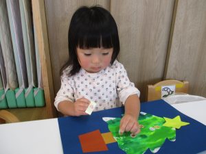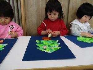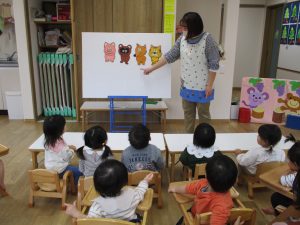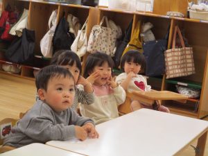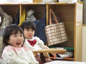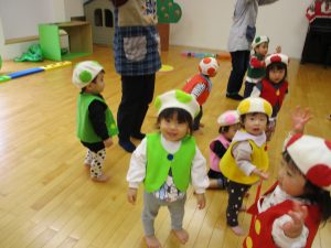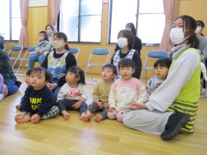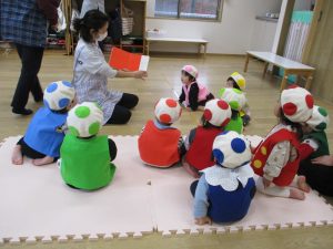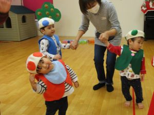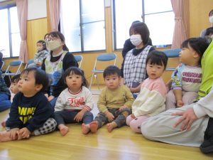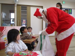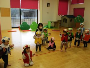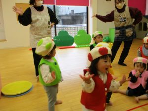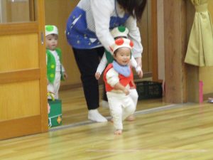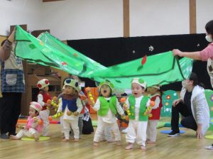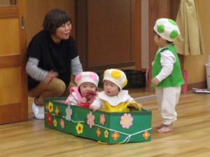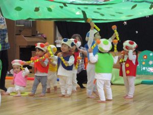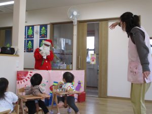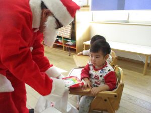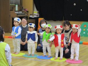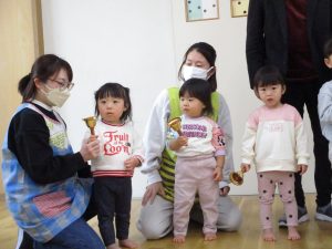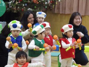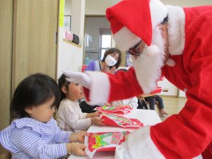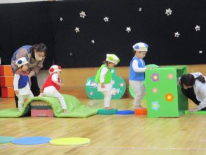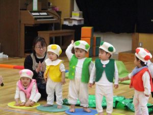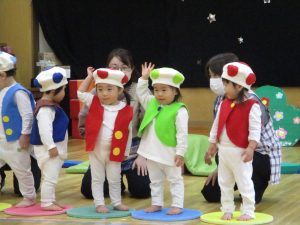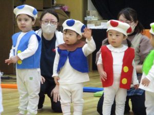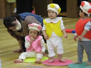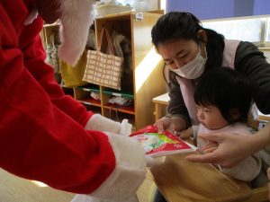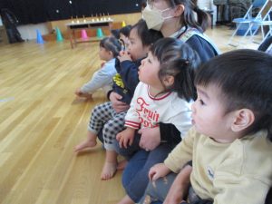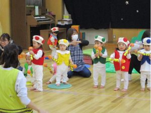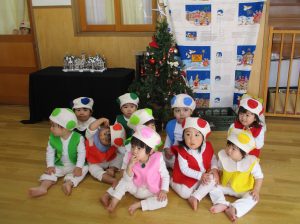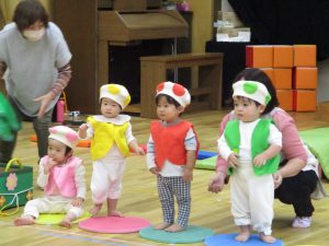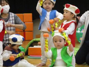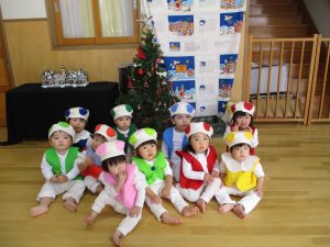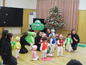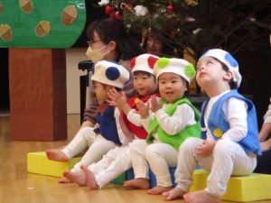 12月はクリスマス会がありました。普段の園での保育士とのやりとりや遊びを盛り込んだ劇遊び。きっと子どもたちはどきどきしたと思いますが、親しみある遊びに触れながら、本番でもとてもかわいらしい姿がたくさん見られ、子どもたちのかわいい姿を温かく見守るお家の方に包まれながら無事終えることができました。ありがとうございました。