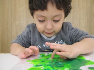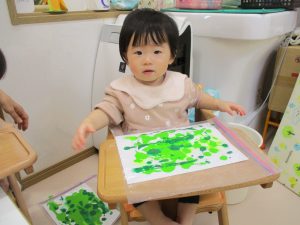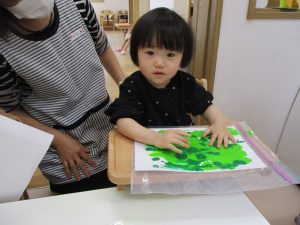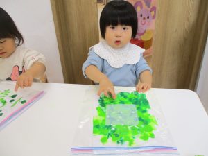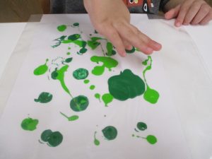 絵の具を垂らした画用紙をフリーザーバックに入れて、指で押し広げました。
