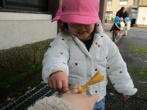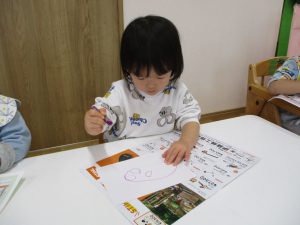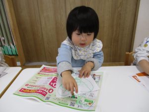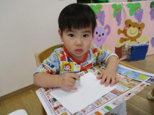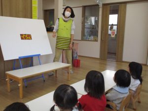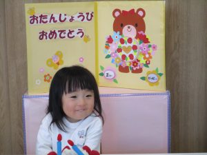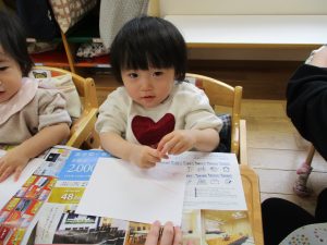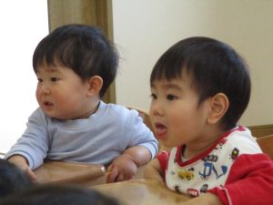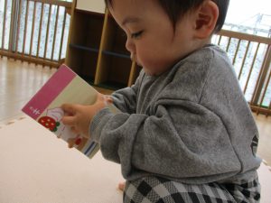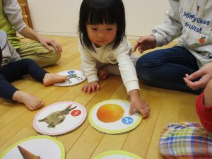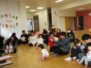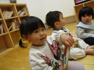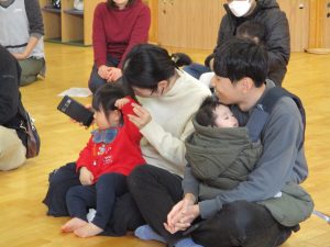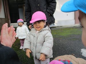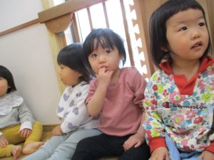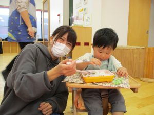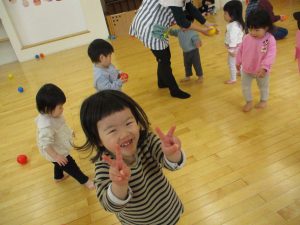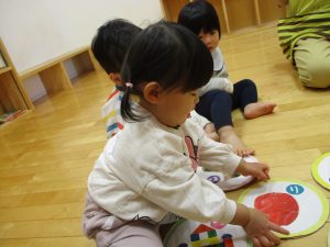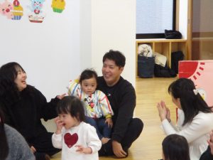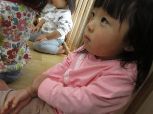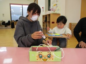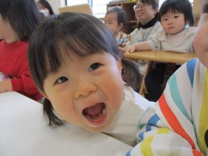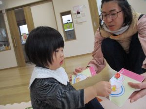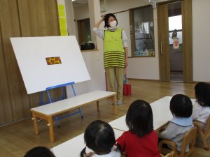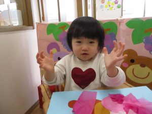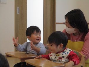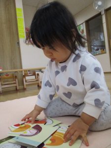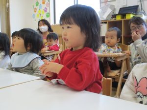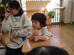 ぴっぴ組さんの一人ひとりの名前を呼びながら「○○ちゃんだいすき」と言いました。「だーいすき」と言われると嬉しいね、という話をし、肯定的な言葉を指す『フワフワ言葉』にふれてみました。中にはその話をした直後に「先生、だーいすき」と言ってくれたお友だちもいるんですよ!子どもたちからも愛を教えてもらいました。