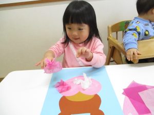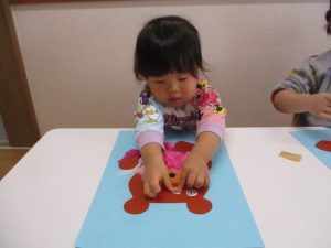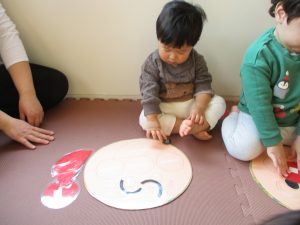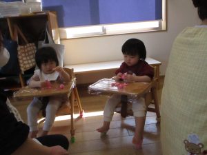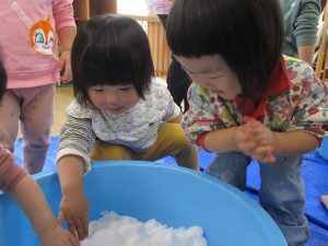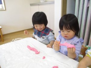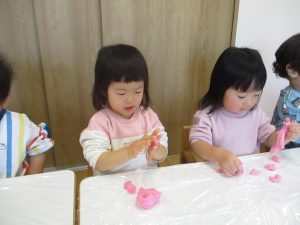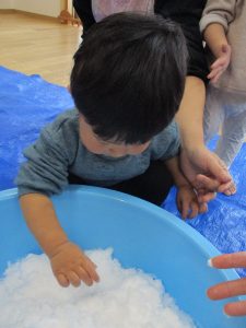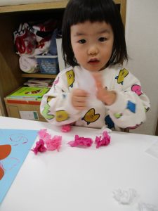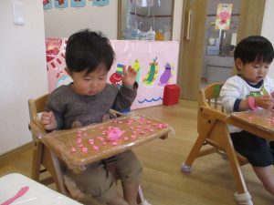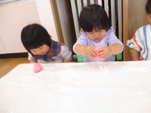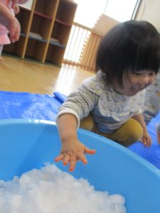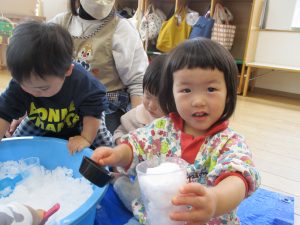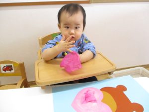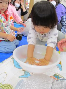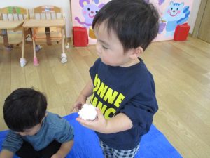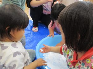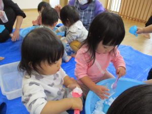 ぺたーん、プチッ、ニョロ、ころころ、冷たい、など色々な感触を楽しみ、手先をたくさん使って遊びました。